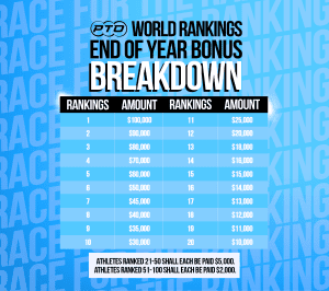 The PTO World Ranking System is based on the average number of PTO World Ranking Points that athletes have earned for their three best races in 2021. Full details here. The PTO Annual bonuses of $2,000,000, will be paid equally to men and women PTO Professionals based on the PTO World Rankings as calculated as of December 31st.